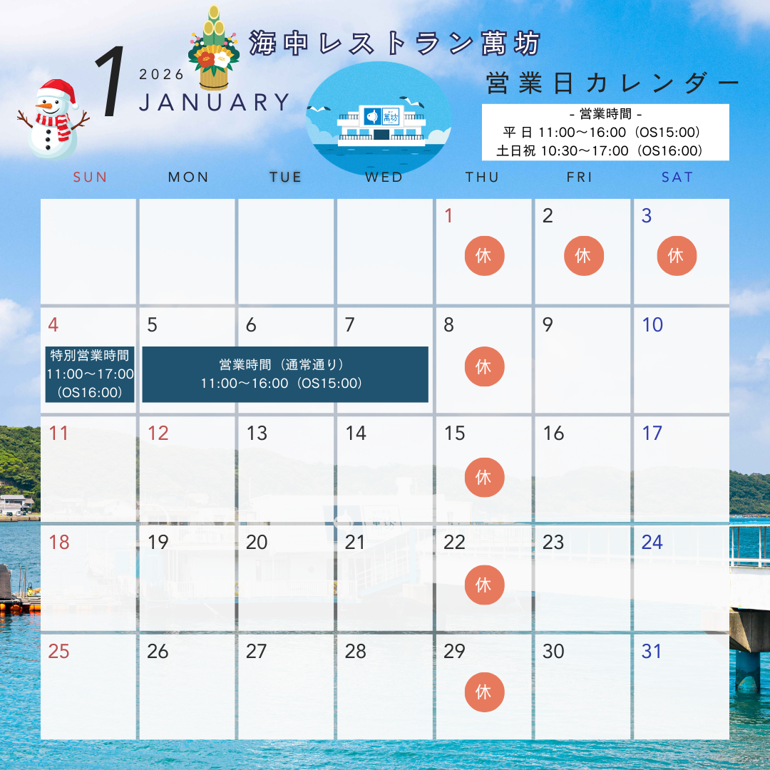 詳細は海中レストラン萬坊 Tel:0955-82-5333 へお電話ください。